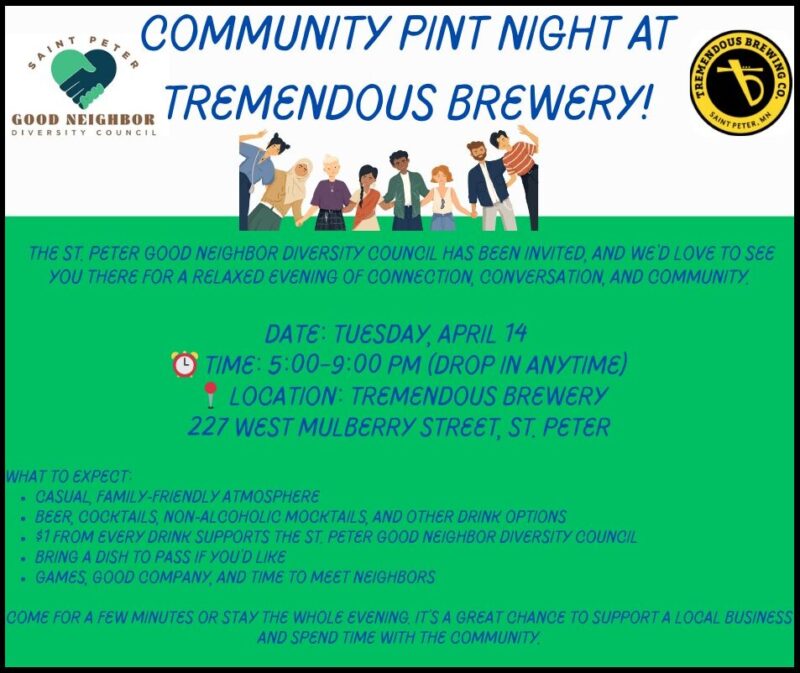 The St. Peter Good Neighbor Diversity Council has been invited, and we’d love to see you there for a relaxed evening of connection, conversation, and community.
