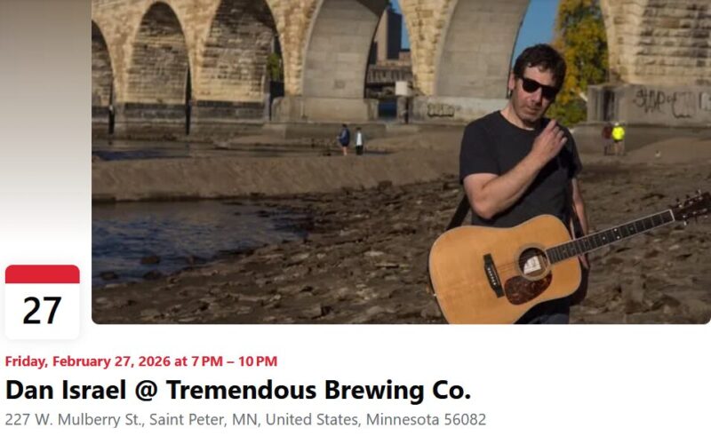 Dan Israel is a longtime fixture on the Minneapolis music scene. He was the first guest on 89.3 The Current’s “Local Show” and has been called “the hardest working singer-songwriter in Minnesota.” He won Song of the Year (for “Come to Me”) in the 2005 Minnesota Music Awards and Songwriter of the Year in the 2006 MMA’s. He received a 4-star review from the UK’s “Uncut” magazine for his 2007 album “Turning.” He has released 17 critically acclaimed albums, including his latest, 2022’s “Seriously,” which many critics and fans have praised as his finest record yet.