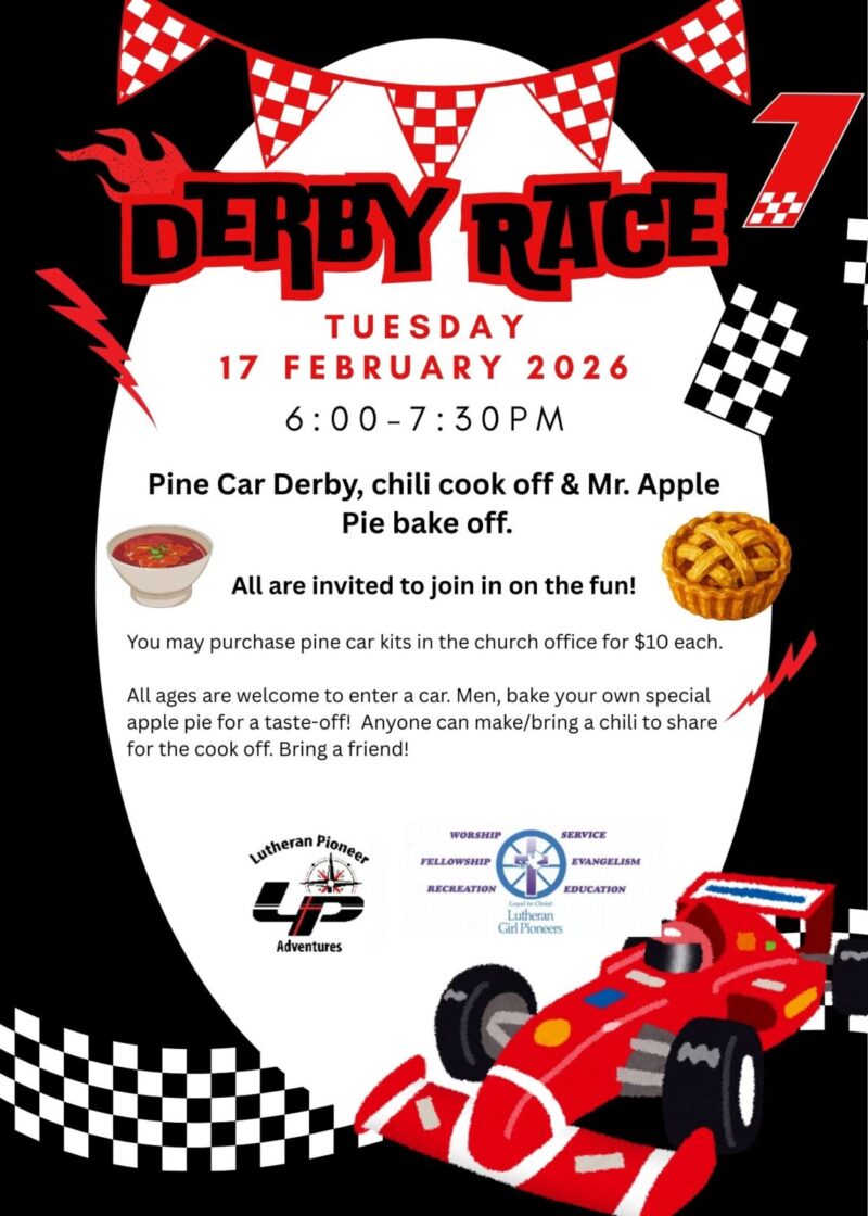 Pine Car Derby, chili cook off & ‘Mr. Apple Pie’, Wednesday, February 17, 6-7:30pm in the fellowship hall. All are invited to join in on the fun. You may purchase pine car kits in the church office for $10 each. All ages are welcome to enter a car. Men, bake your own special apple pie for a taste-off!