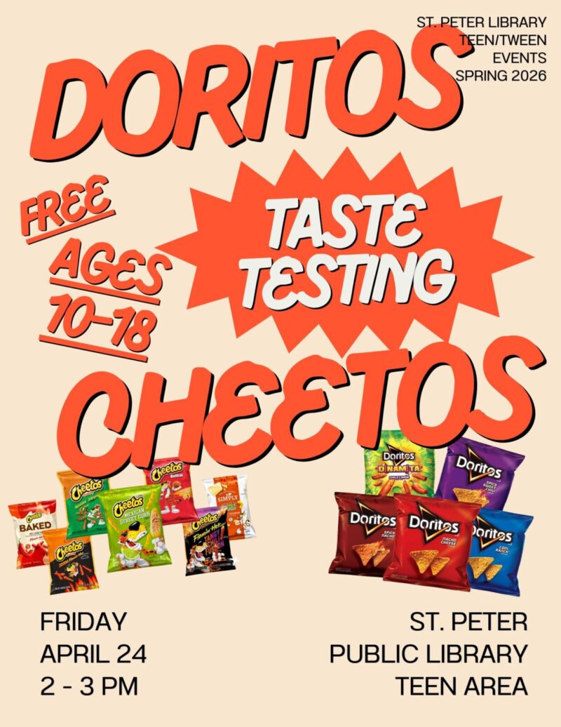 Come taste test different Cheetos and Doritos at the library! This event is free and starts at 2pm. If you are new to our taste testing events you are given a chance to test all the flavors we have, rank them, and then eat a few more of your favorite